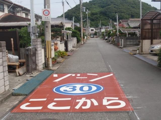 学童通学路等での通行車両の速度超過による事故対策として、ゾーン30区間を指定し、運転手に注意喚起を促す路面標示です。